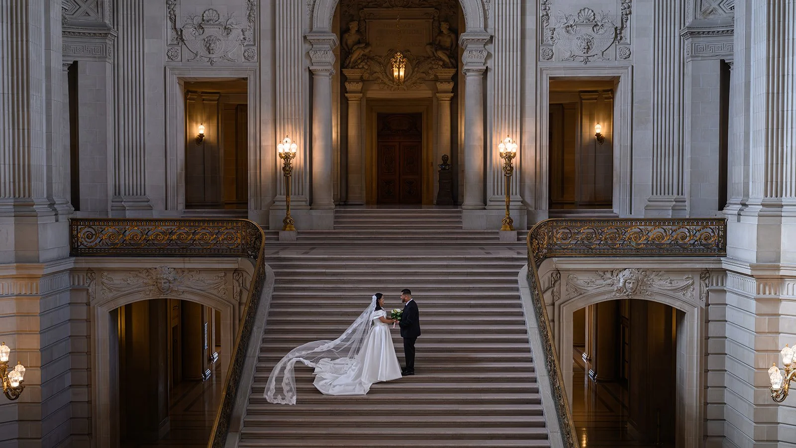 City Hall was made for this. The grand staircase, the marble floors, the high ceilings, it all pairs so beautifully with a flowing dress or long train.