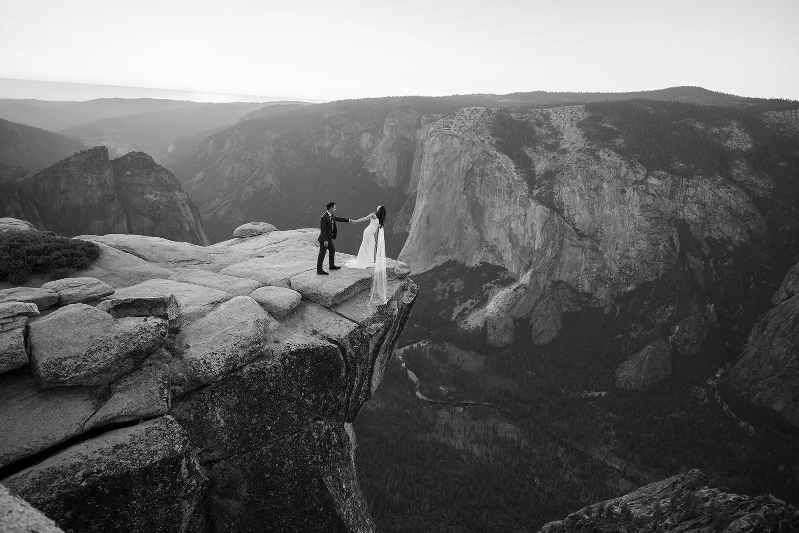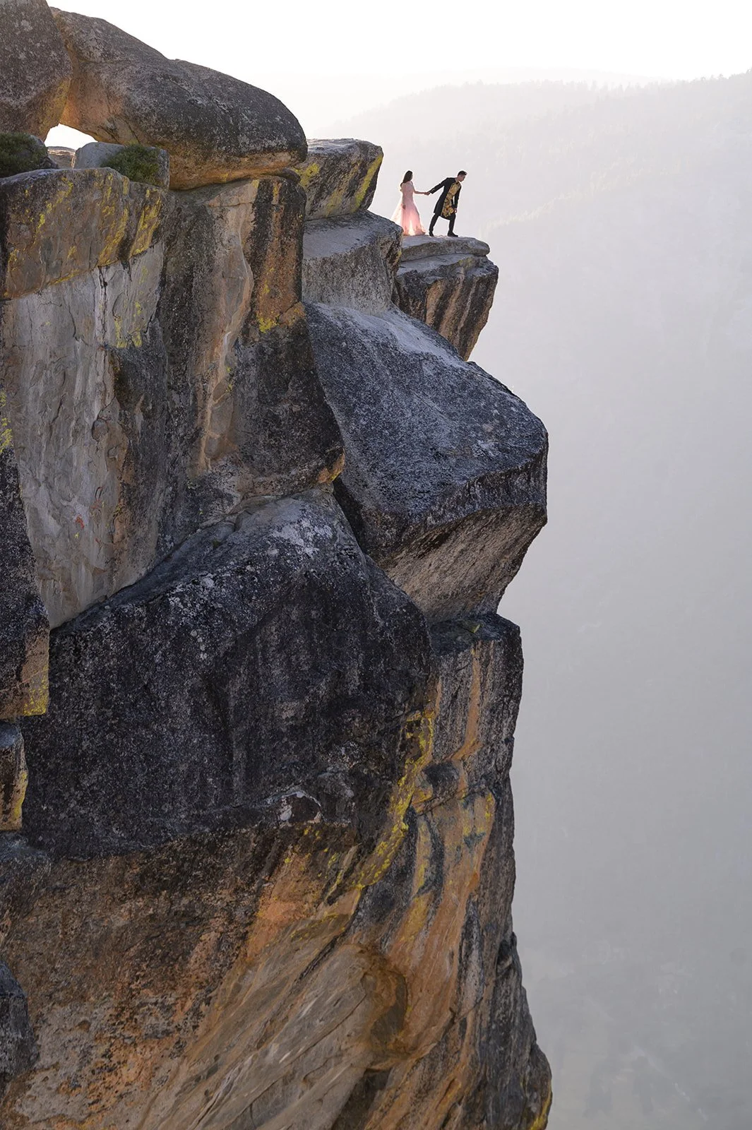 Throughout the day, we planned natural breaks for outfit changes—starting with her traditional look for sunrise portraits and private vows, then switching into her white dress for their Yosemite Valley adventures and for her vows at Taft Point. The changes felt seamless and allowed us to capture two different sides of their story, both equally beautiful and meaningful.