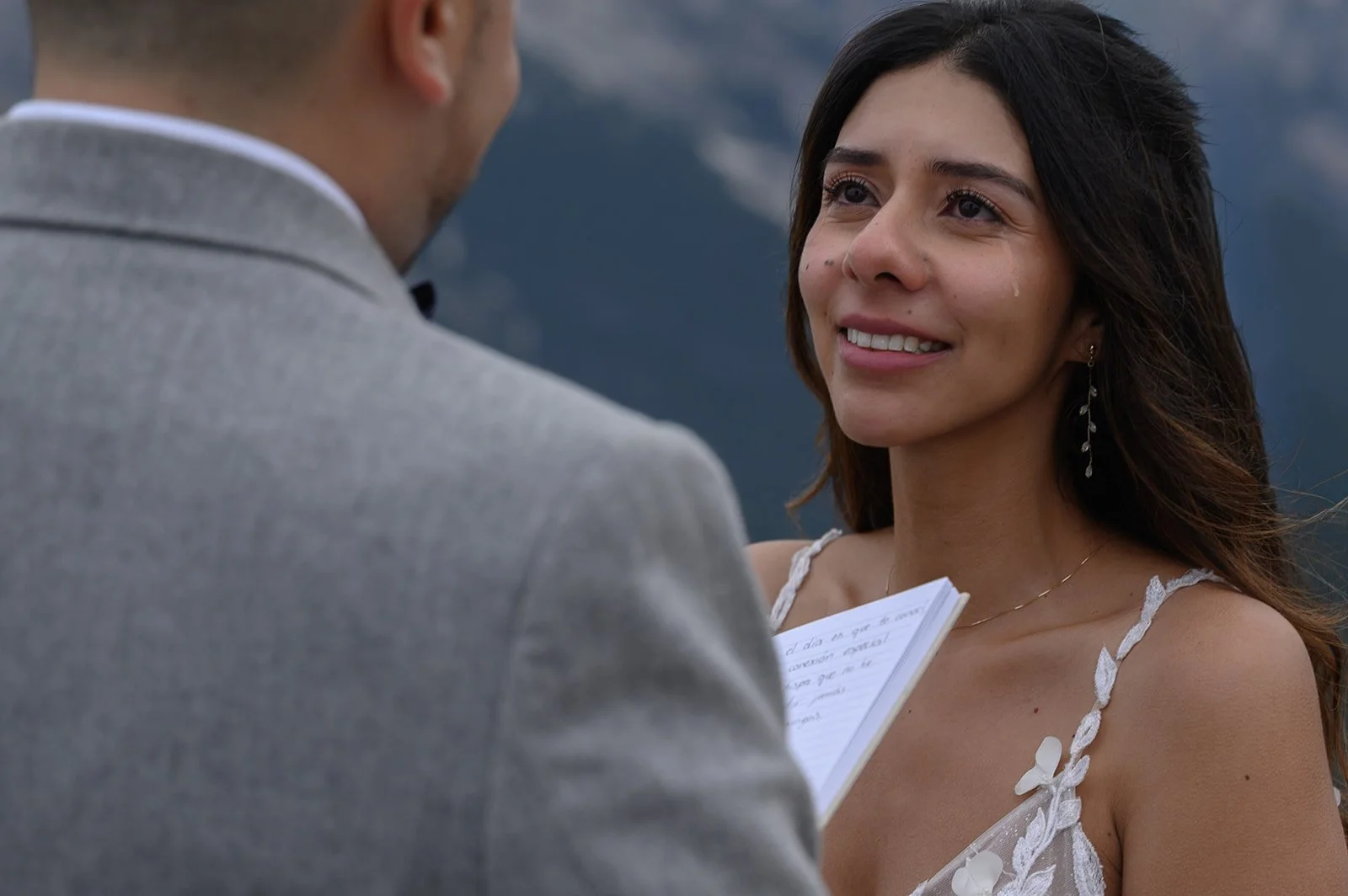 We eventually found a completely quiet spot surrounded by towering peaks. The mountains felt enormous behind them as they turned toward each other to read their vows.